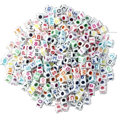 Kvadratiske perler med bogstaver og tal – perfekte til at skabe personlige smykker, nøgleringe eller dekorationer med navne, ord eller budskaber. Perlerne er ca. 6,5 mm store og har et hul på ca. 0,35 mm.