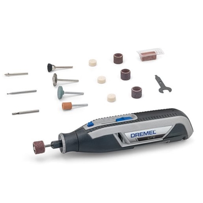 Dremel Multi Tool 7600 3,6 V. Lille og let ledningsfri model med komfortabelt blødt greb. Vægt 0,27 kg. Omdr.tal 8000-25000 omdr/min. Meget velegnet til præcisionsarbejde. Har litiumjonbatteri som beholder opladningen op til 6 gange længere. Har 3,2 mm borepatron og spindellås. Leveres med netadapter (opladningstid 2 timer 45 min), USB-kabel og 15 stk tilbehør til gravering, slibning, polering, kapning m.m. Quick Start Guide medfølger.