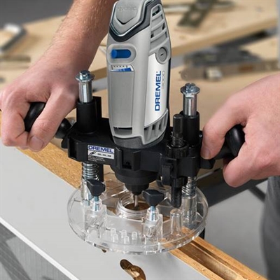 Overfræserforsats til Dremel multiværktøj. Med dette sæt kan du nemt fræse med stor nøjagtighed, stabilitet og kontrol i dine mindre til mellemstore fræseprojekter.