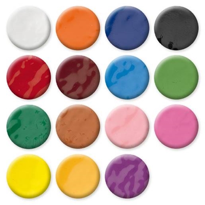 Efcolor startsæt indeholder dåser smeltepulver i farverne hvid, orange, blå, sort, koralrød, mørkerød, lyseblå, lysegrøn, mørkegrøn, brun, rosa, cerise, citrongul, guldgul og violet.