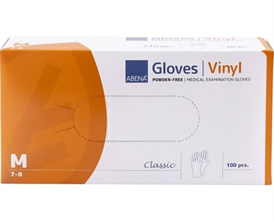 Vinylhandsker str. M uden latex samt uden pudder. Handsken er transparent og til engangsbrug. Også godkendt til kontakt med fødevarer.