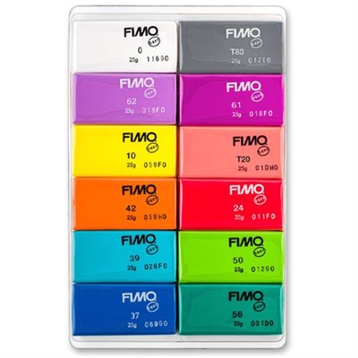 FIMO Soft er en smidig lertype af polymer, der er let at arbejde med og som kan bruges til bl.a. smykkefremstilling, miniaturer, legetøj, dukker m.m. Sættet indeholder farverne white, lemon, indian red, pacific blue, peppermint, pink grapefruit, tangerine,apple green, emerald, purpure, lavender og stormy grey. Farverne kan blandes indbyrdes så du nemt kan skabe en mængde nuancer. FIMO Soft kan desuden blandes med FIMO Effect, FIMO Leather og FIMO Professional. FIMO Soft er fri for phthalater. Hærdes i en ganske almindelig køkkenovn ved 110 grader C i 30 minutter. Anvend ej mikroovn. For at opnå et mere holdbart resultat kan leret lakeres efter bagning med FIMO-lak. Ej velegnet til børn under 8 år. 12x25 g.