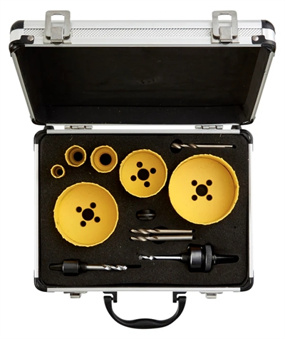 Hulsavesæt i kuffert med 6 størrelser og 6 andre dele. I bimetal. Kopborsdybde: 40 mm. Størrelse: 16 - 25 - 32 - 57 - 76 - 83 mm. Hex Borholder: 3/8“ - passer op til 32 mm Hex Borholder : 7/16“ - passer til 32,152 mm 5 stk. pilotbor 1 stk. adapter
