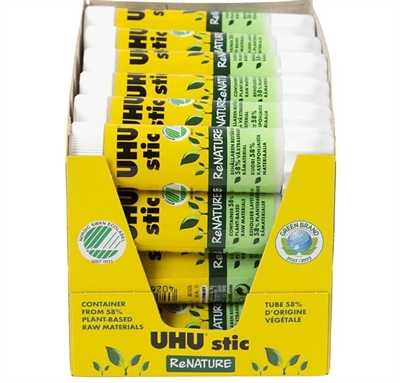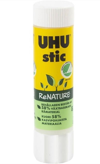 UHU ReNATURE fremstillet af 70 % naturmaterialer og er 100 % genanvendelig for at reducere dens miljøpåvirkning. Klæber øjeblikkeligt på papir, karton mm. Skruelåg forhindrer udtørring. Indeholder ikke opløsningsmidler og kan vaskes af med koldt vand - ufarlig for børn