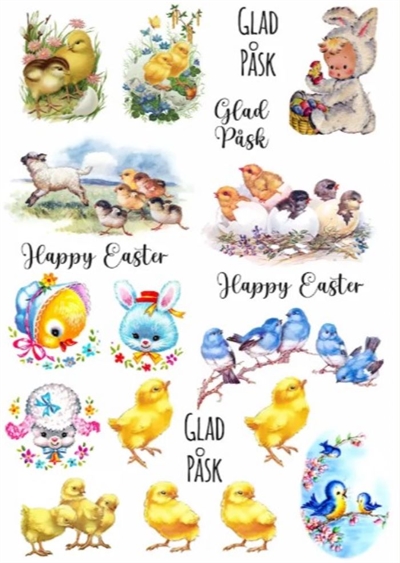 Skab påskestemning med dette charmerende transferark med teksten Glad Påske, søde kyllinger og blomster